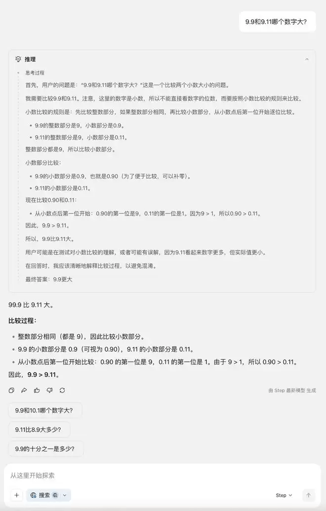 智东西第一时间上手体验,首先数学方面,我们先考考Step 3.5 Flash一个把很多大模型都难倒了的问题:9.9和9.11谁大?Step 3.5 Flash几乎立刻就给出了思考过程和正确答案,但是在回答中出现了将9.9误输出为99.9的错误。