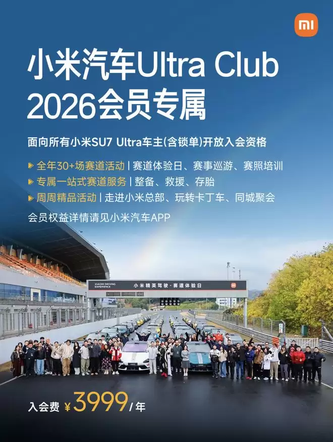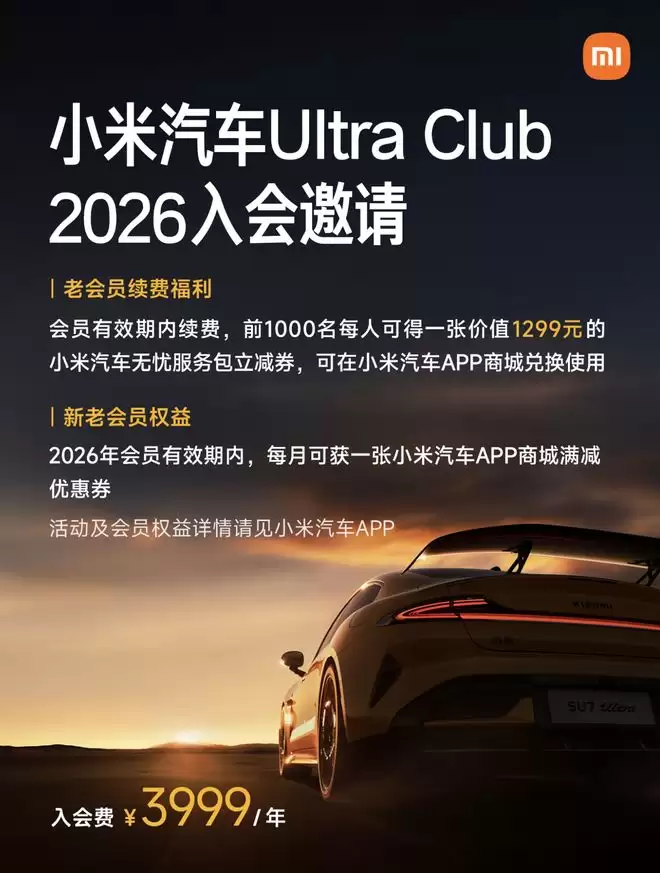 IT之家2月2日消息,小米汽车通过其官方微博宣布,将于2026年对UltraClub会员权益进行新一轮升级。据悉,新入会费为3999元,现有会员在有效期内完成续费,前1000名每人可获赠一张价值1299元的小米汽车无忧服务包立减券。此外,无论新老会员,每月均可领取一张小米汽车App商城的满减优惠券。