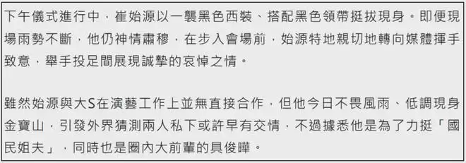 连一向和S家关系紧密的台媒都没收到消息,看到韩星现身很是诧异,了解之后才知道突然出现在大S周年仪式现场的韩星名叫崔始源,台媒各种猜测崔始源出现原因,以为他和大S私下有交集,真相却是崔始源来支持具俊晔了。
