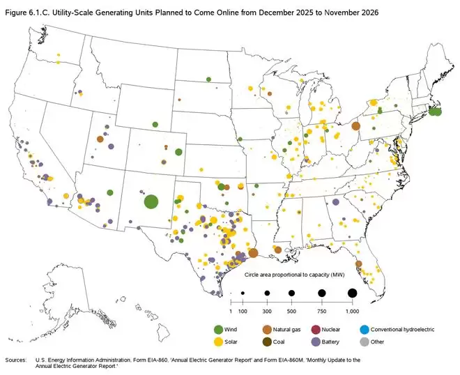EIA预测,这一趋势将在2026年延续并加速。未来12个月,全美公用事业规模可再生能源与电池储能预计将新增69,579.1兆瓦。同时,天然气装机预计仅增3,960.7兆瓦,其中大部分增幅将被预计减少的3,387兆瓦煤炭装机所抵消。石油等其他发电来源装机也将减少,截至IT之家发稿时,美国尚无新增核电计划。