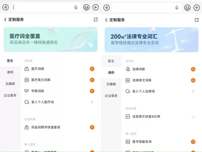 值得一提的是,搜狗输入法还与腾讯医典、得理科技等权威数据库合作,分别为医生、律师等专业人群提供独创的AI定制化服务,包括专业词快输,法律词条、用药说明快查等多种提效服务。