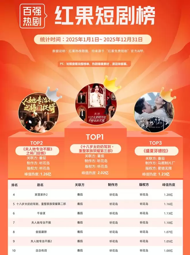 近日红果短剧2025年百强热剧出炉,值得注意的是热度最高的10部作品中,除了排名第三的《盛夏芬德拉》,其余九部全部出自同一家制作公司听花岛。