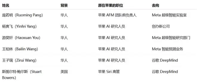 AFM团队前负责人庞若明(Ruoming Pang)于2025年夏天跳槽至Meta的“超级智能实验室”。目前,AFM团队由AI研究员陈志峰(Zhifeng Chen)领导。