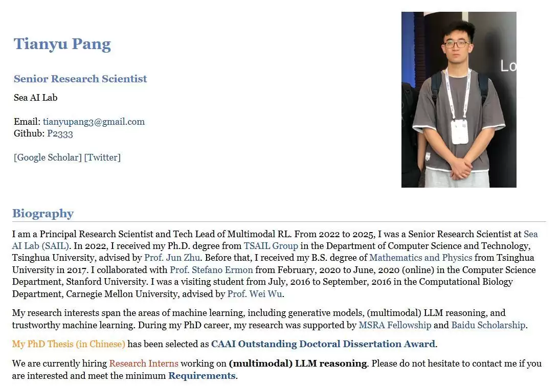 2024年从清华大学博士毕业后,庞天宇没有选择留在国内,而是前往新加坡,加入了由知名学者颜水成领导的Sea AI Lab,担任高级研究科学家。该实验室由颜水成等知名学者领导,曾是东南亚最顶尖的AI研究机构。