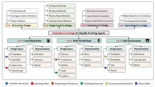 王昱兴告诉 DeeTech:“这篇综述论文首次明确定义了具身协同设计(Embodied Co-Design)这一研究问题,并系统性地梳理了该领域的理论基础、方法框架与应用进展。其中最重要的贡献之一,就是我们提出的双层分类体系。这个体系能够作为一种沟通与协作的框架,刺激并鼓励来自人工智能、机器人、材料学等不同领域的学者开展相互合作。”