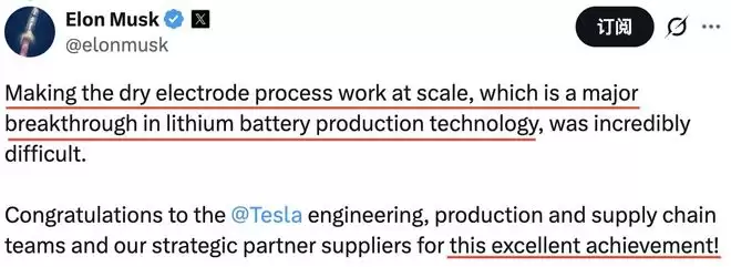 对此,马斯克也在社交媒体平台专门发文,祝贺特斯拉工程师团队在干电极工艺上取得的成就。