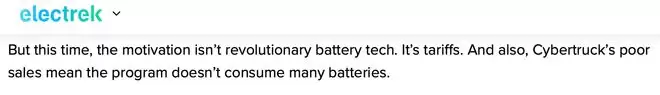 也有外媒Electrek“锐评”,这次发布更像“关税对冲”而非“革命性电池终于普及”,因为特斯拉在同一段话里几乎只谈供应链风险,并未谈任何面向用户的产品收益。