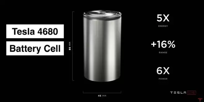 特斯拉的4680电池最早可以追溯到2020年的特斯拉Battery Day(电池日),“4680”最直观的含义是电芯尺寸,即这是一个直径约46mm、高度约80mm的大圆柱电芯。