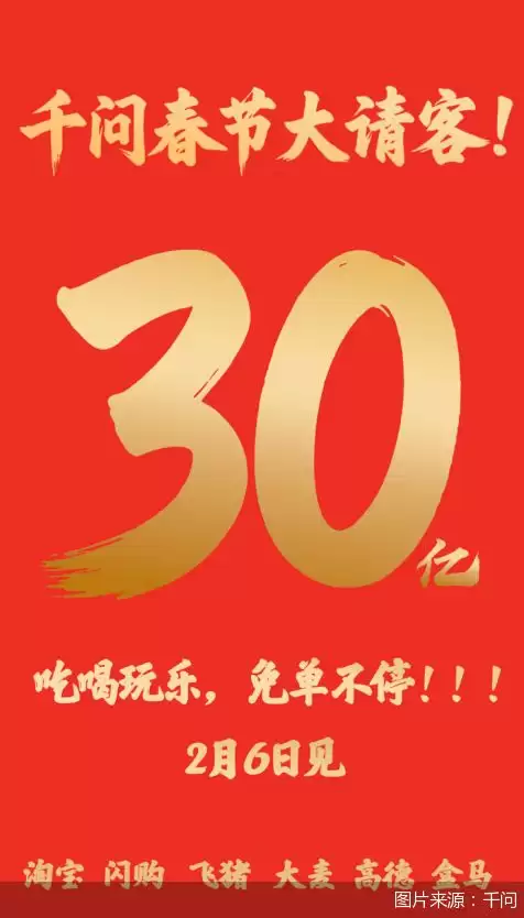 "千问春节大请客"活动的海报中也突出了阿里旗下的各项服务,淘宝、闪购、飞猪、大麦、高德、盒马。主打"吃喝玩乐,免单不停"。据悉,此次千问30亿元春节请客计划,是阿里历史上春节投入最大的活动。