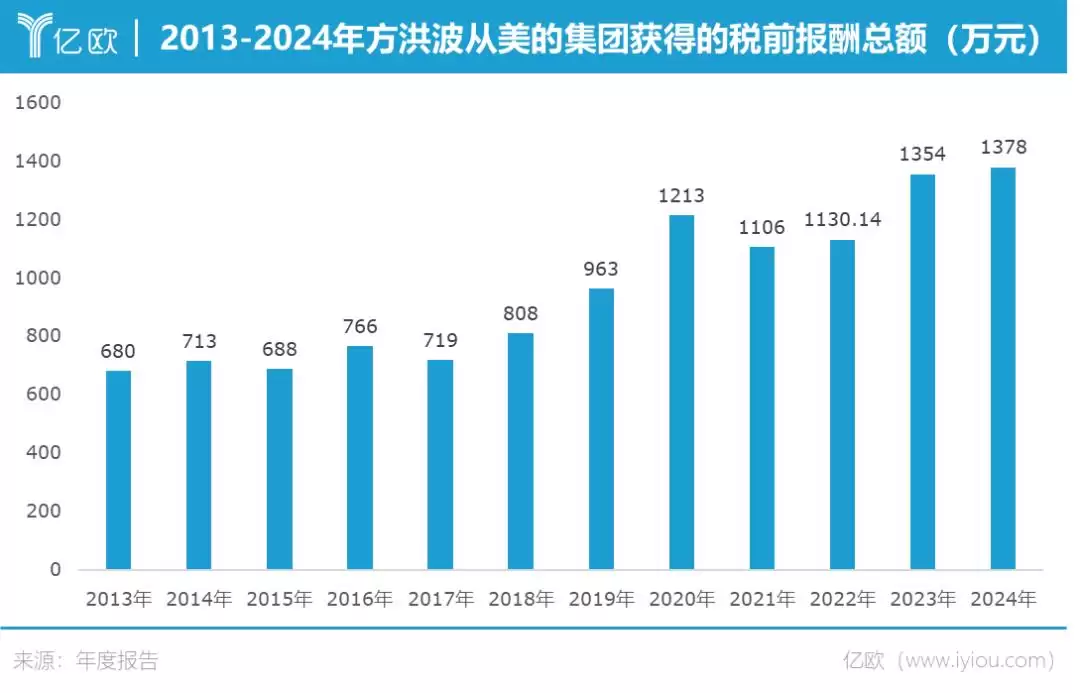 从个人履历来看,方洪波于2012年接替创始人何享健,成为集团第二任董事长。自2013年至2024年间,方洪波从美的集团获得的税前报酬总额整体呈现上升趋势,累计约为1.15亿元。
