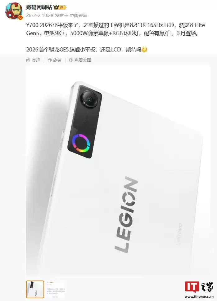据IT之家观察,数码博主@数码闲聊站今日发文透露,联想拯救者Y700 2026款小平板将成为2026年首款搭载骁龙8E5旗舰芯片的小平板。工程机配备了8.8英寸3K 165Hz LCD屏幕,搭载骁龙8 Elite Gen5处理器,电池容量达到9000mAh级别,后置5000万像素单摄并搭配RGB环形灯,提供黑/白配色。