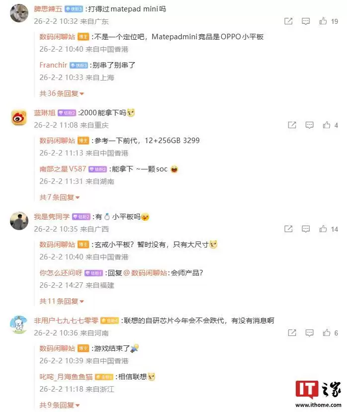 有网友询问联想拯救者Y700 2026款的价格能否来到2000元档,博主回应称:“可以参考上一代,12+256GB版本定价3299元。”另有网友问及是否会推出玄戒小尺寸平板,博主回复表示:“玄戒小平板?暂时没有,目前只有大尺寸版本。”
