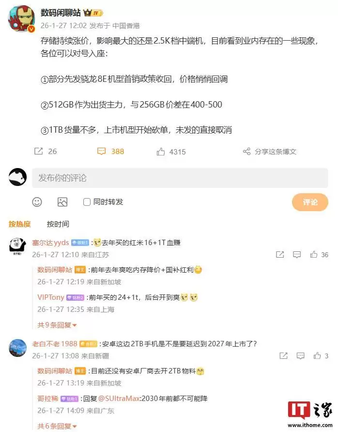 参考IT之家此前报道,该博主曾在1月27日透露,当前存储涨价影响最大的仍是2500元档的中端机型。业界已陆续出现“部分骁龙8E机型的首销政策被收回,价格悄然回调”、“512GB版本成为出货主力,与256GB版本价差拉大到400-500元”、“1TB版本货量不多,部分已上市机型开始砍单,尚未发布的机型则直接取消”等情况。
