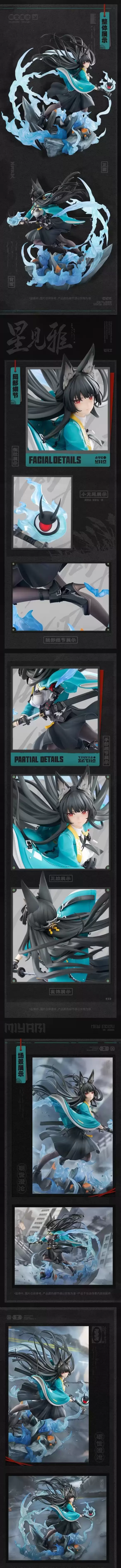 手办生动捕捉了星见雅挥刀斩击的瞬间姿态:银白长发在能量激流中飘逸舞动,蓝白配色的狩衣衣摆塑造出凌厉的褶皱效果。面部刻画细腻传神,精准再现了战斗时凛然的神情——眉峰微蹙,红色瞳孔如狩猎般专注凝缩,紧抿的嘴角彰显出角色决绝的气质。整体造型兼顾动态张力与细节刻画,兼具收藏与观赏价值。