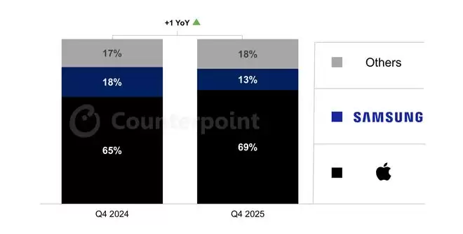 从品牌表现来看,苹果在该季度表现强势,其市场份额从去年同期的65%大幅攀升至69%,创下该品牌历史新高。相比之下,三星的市场份额则从18%下滑至13%。