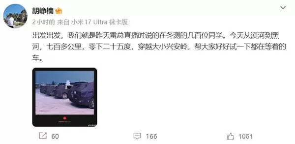 近日,小米汽车再度吸引了全行业的关注。其全新大型增程SUV的实车首次通过最新渠道亮相,引发了市场的广泛热议。据顺为资本投资合伙人、小米造车顾问胡峥楠在微博发布的动态显示,四款伪装测试车正在漠河至黑河的极寒环境中进行冬季测试。车队全程穿越大小兴安岭,覆盖超过700公里的低温路段,测试环境温度低至零下25摄氏度。