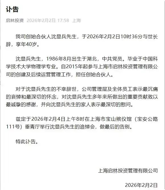 2月3日有消息传出,据上海证券报报道,私募机构启林投资发布公告称,公司创始人合伙人沈显兵已于2026年2月2日10时36分与世长辞,享年40岁。