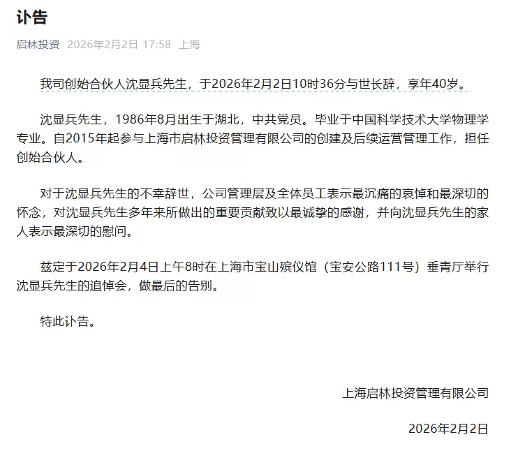 启林投资,这家管理规模超过150亿的国内头部量化私募机构,今日发布了一则令人沉痛的讣告:其创始人之一沈显兵先生因病辞世,年仅40岁。这位毕业于中国科学技术大学物理学专业的金融才俊,自2015年起便深度参与公司的创立与运营,担任副总理职务,与团队齐心协力将启林投资推向了行业前沿。