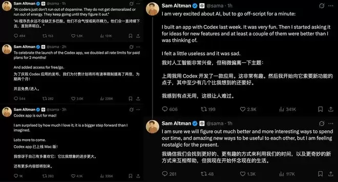 OpenAI联合创始人、CEO萨姆·阿尔特曼(Sam Altman)连发5条推文庆祝Codex应用发布,他直言“很惊讶自己会这么喜欢它(Codex)”。阿尔特曼还自曝前几周用Codex开发了一款应用,AI对新功能的建议很好,让他感觉“自己有点没用,让人难过”。