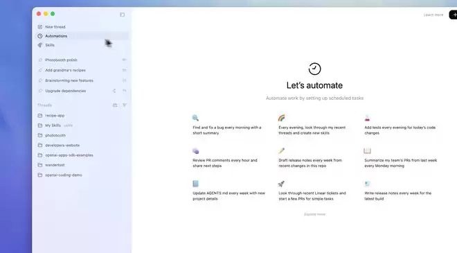 使用Codex应用,开发者还可以设置自动化任务,让Codex在自动计划下后台运行。自动化任务将指令与可选技能相结合,按照开发者定义的计划执行。当自动化任务完成后,结果会进入审核队列,以便开发者在需要时可以重新介入并继续工作。