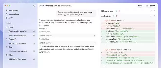智能体可以在按项目组织的独立线程中运行,因此开发者可以在不丢失上下文的情况下无缝切换任务。该应用允许开发者在线程中查看智能体的更改,对差异进行评论,甚至可以在编辑器中打开它以进行手动更改。