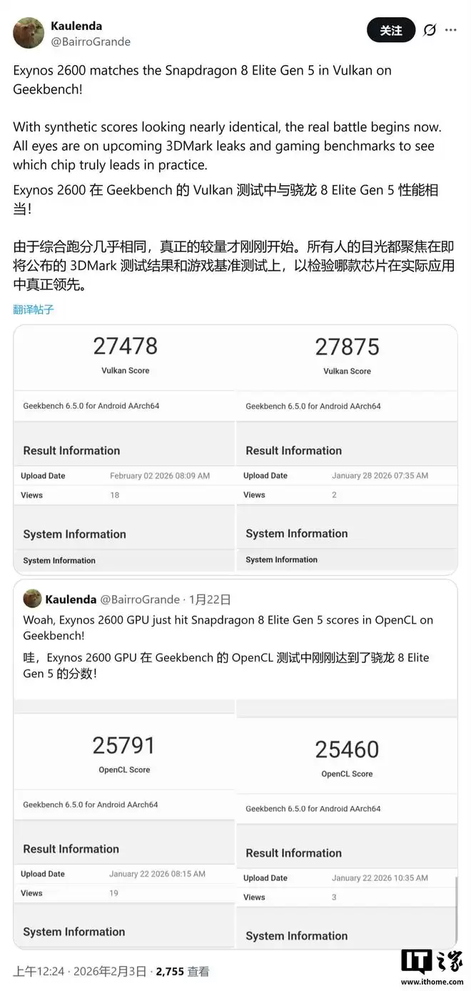 IT之家曾在一月份报道,在GeekBench OpenCL跑分测试中,Exynos 2600获得了25396分。其性能的稳定性是目前第五代骁龙8 Elite Gen 5(即骁龙8至臻版)所“无法比拟”的。