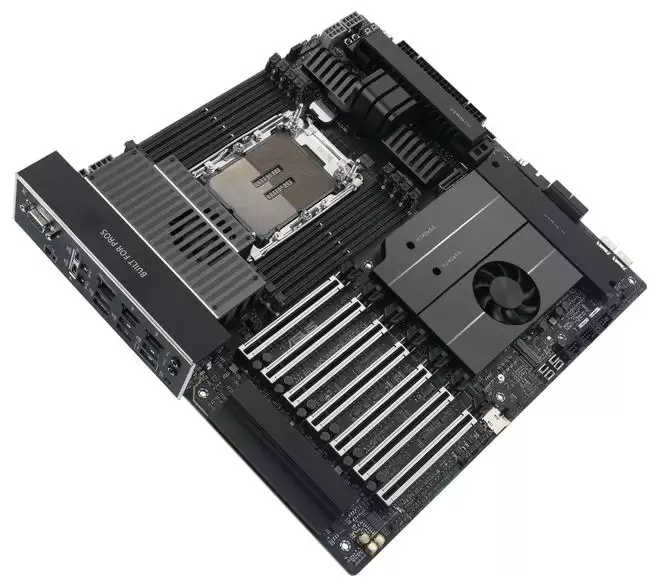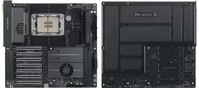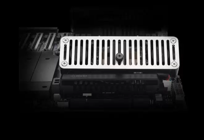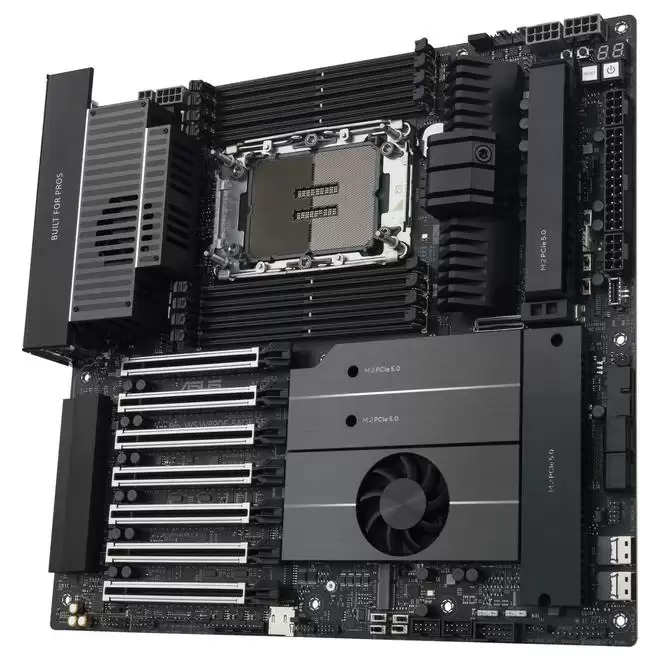 这款主板采用12英寸×13英寸的SSI-EEB版型,配备了16+2+2+1+2相的供电设计。它拥有7条全长物理PCIe 5.0插槽,并搭载了基于信骅AST2600芯片的BMC管理方案。供电元件覆盖了铝制散热片,左侧内置了散热风扇,右侧则支持AngleBoost风扇套件。芯片组和M.2硬盘位均配备了主动散热。