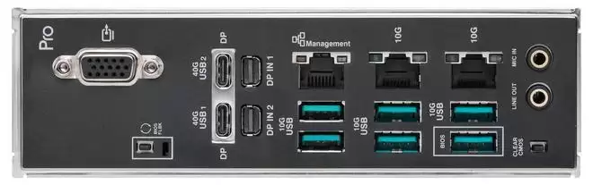 Pro WS W890E-SAGE SE主板的背部I/O接口非常丰富,包括1个源自AST2600的VGA接口、2个USB-C 40Gbps接口、2个Mini DisplayPort输入接口以及6个USB-A 10Gbps接口。板内则包含1组USB-C 20Gbps插针、1组USB 5Gbps一分二插针和2组USB 480Mbps一分二插针。