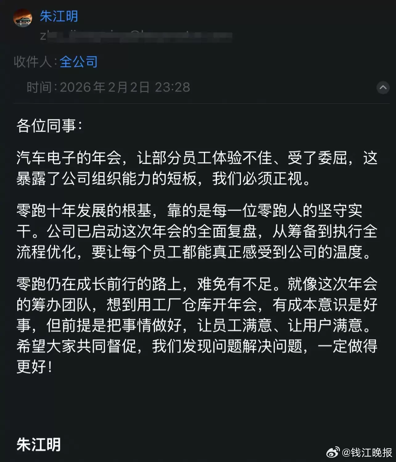 2月3日消息,据钱江晚报报道,零跑汽车2026年年会近日结束后,不少员工在内部爆料吐槽,称这场年会简直“拉垮到离谱”,相关讨论一度引发热议。对此,零跑汽车创始人、董事长朱江明于2月2日深夜发布全员信,承认年会在组织安排上存在不足,公司已启动对此次年会从筹备到执行的全流程复盘与优化。