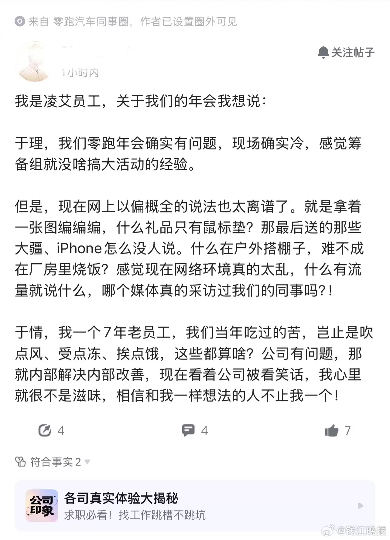 此前有员工透露,零跑年会活动持续到中午却未安排午餐。HR建议大家自带干粮,活动进行到一半,不少人饿得四处找零食,只能啃面包垫肚子。而且现场没有空调,“冷得要命”,厕所数量也严重不足,热水供应跟不上。偏偏还遇上下雨天,部分员工只能在户外临时搭建的棚子里休息。