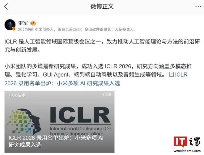 IT之家 2 月 3 日消息,小米创办人、董事长兼 CEO 雷军今日宣布,小米团队的多篇最新研究成果,成功入选 ICLR 2026,研究方向涵盖多模态推理、强化学习、GUI Agent、端到端自动驾驶以及音频生成等领域。