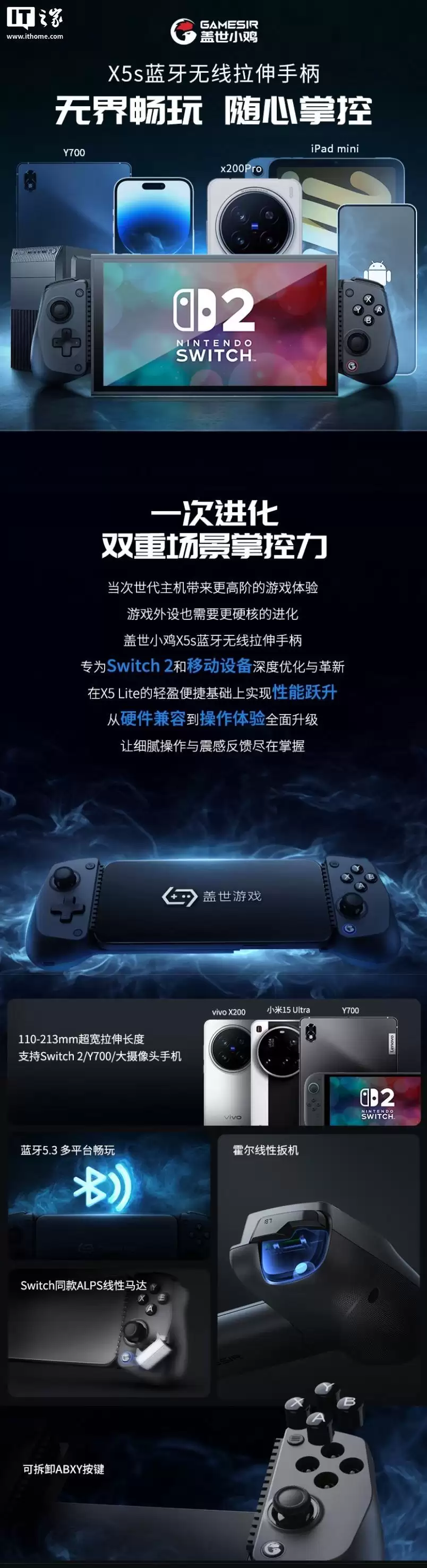 此外,小鸡X5s手柄于去年6月发布,是一款无线拉伸手柄。它采用可拆换的Xbox布局按键,配备了与任天堂Switch同款的ALPS线性马达,拥有HD震动体感功能,官方定价为269元。