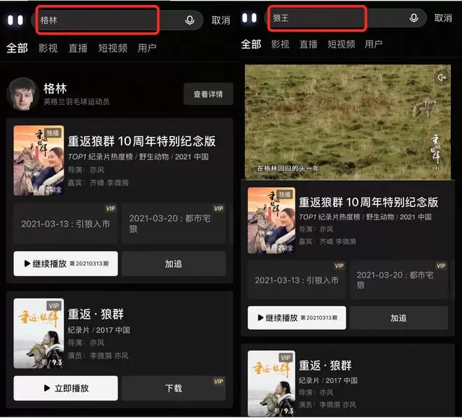随着站内热度持续走高,运营侧立即将站内高搜词做了搜索优化,新增了“格林狼王”“重返狼群催泪后续”“重返狼群再见格林”“重返狼群完整版”等,保证用户搜索就能看到纪录片。12号当天纪录片频道的大小屏都在推荐重返狼群,13号也加入了对电影版的大小屏推荐。14号放出11集后,在OTT端以曝光资源触达到核心人群;同时通过向站外做Push推送,站内节目评论区公告置顶公示11、12集重新放出,激活原本关注的用户。