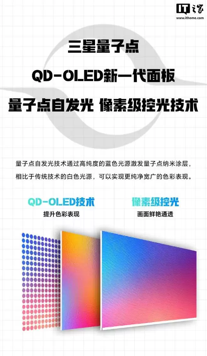 据介绍,这款显示器搭载三星量子点面板,可通过自发光技术激发量子点纳米涂层,获得更纯净的色彩表现,分辨率为 2560*1440,支持 240Hz 高刷,GTG 响应时间可达 0.03ms,覆盖 100% sRGB 色域、99% DCI-P3 色域以及 98% Adobe RGB 色域,ΔE≤1,满足游戏之余的观影、修图需求。