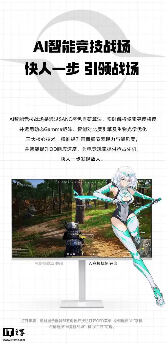 此外,这款显示器还带有“一键战斗”模式,可将画面缩小至 24.5 英寸,兼容 FreeSync/G-Sync 防撕裂技术,搭载两个 HDMI 2.1 接口以及一个 DisplayPort 1.4 接口,广泛兼容各种笔记本、台式机和游戏机,支持 VRR 可变刷新率。