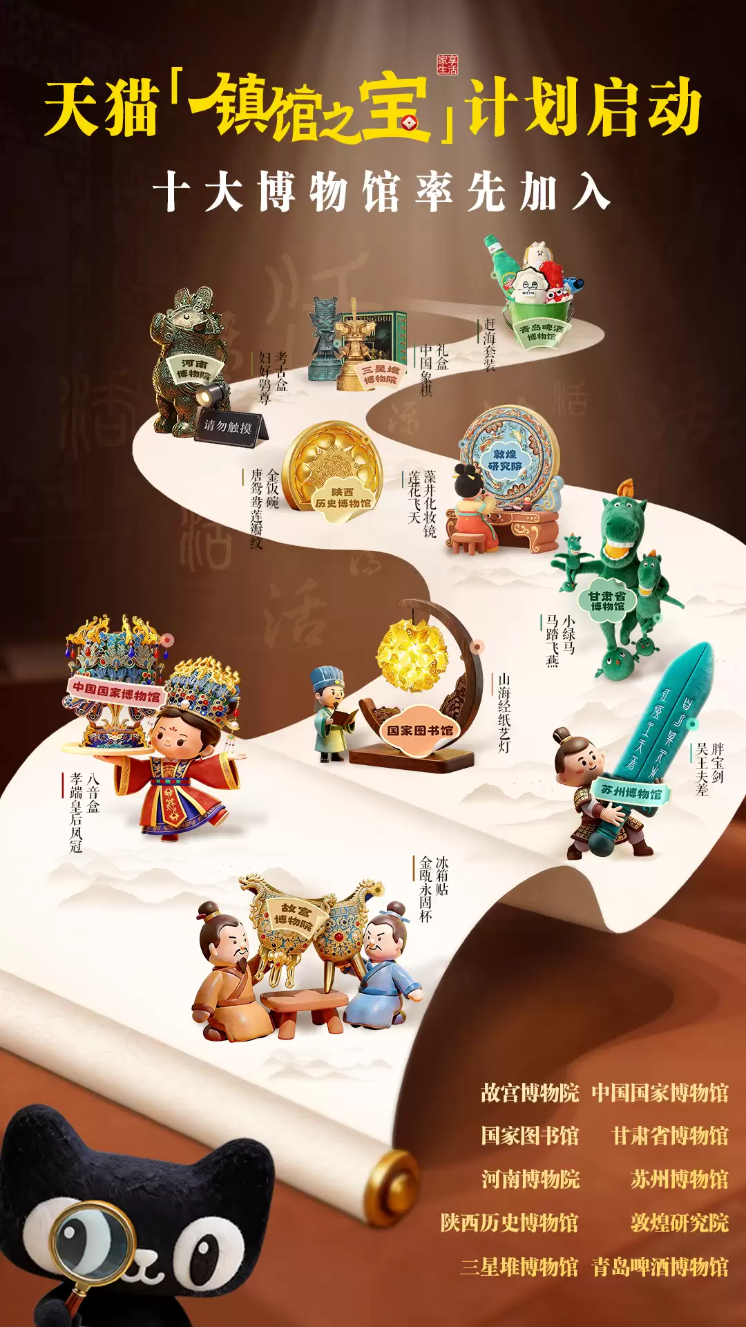 据了解,共有中国国家博物馆、故宫博物院、国家图书馆、甘肃省博物馆、河南博物院、苏州博物馆、陕西历史博物馆、敦煌研究院、三星堆博物馆、青岛啤酒博物馆10家博物馆,以及萬仟堂、太湖雪、铜师傅、罗莱等品牌,共同启动了天猫“镇馆之宝”计划。