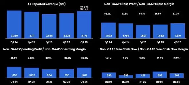 再譬如,恩智浦2025年第三季度营业收入为31.73亿美元,同比下降2.37%;净利润为6.31亿美元,同比下降12%。