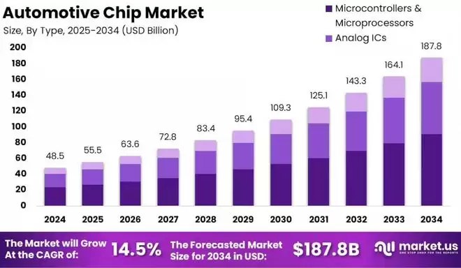 Market.us的报告显示,全球汽车芯片市场预计将从2024年的485亿美元增长至2034年的1878亿美元,年复合增长率高达14.5%,这一增长主要来源于汽车电气化、自动化和车联网的加速演进。