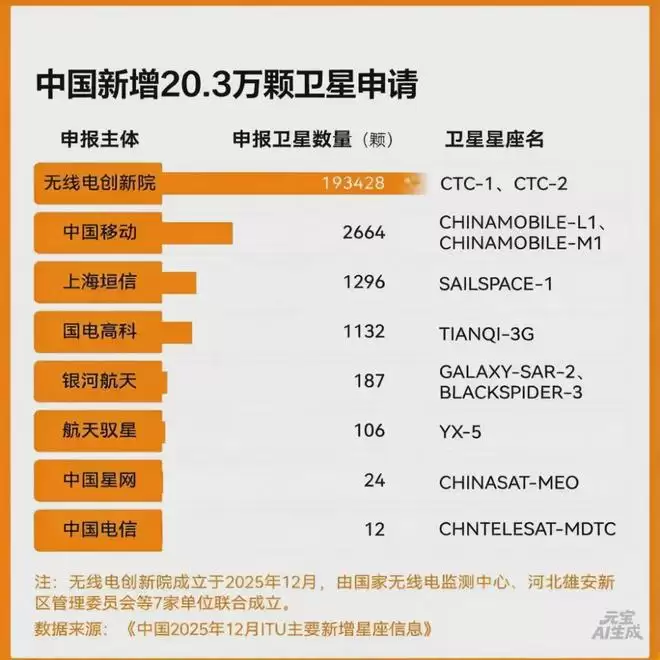 中国申报的约20.3万颗卫星并非单一星座,而是由无线电创新院等国家队牵头,联合中国移动、国电高科等多家单位共同规划,细分为了14个不同星座。