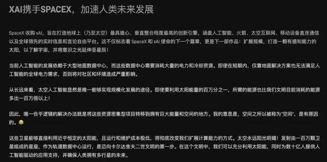 这一宏大野心,在马斯克于收购后发布的内部备忘录中得到了赤裸裸的阐述。他表示,收购xAI旨在“整合AI、火箭、天基互联网...打造地球上最具雄心、垂直整合程度最高的创新引擎”。他明确指出,这次收购的核心目的,就是使合并后的公司能够在太空中部署数据中心。