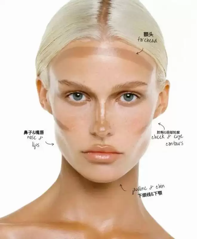 总的来说,新手修容一定要“少量多次”,晕染到位,圆脸重点修下颌线和颧骨,拉长脸型;方脸重点柔化下颌转角,避免过于凌厉;长脸减少额头和下巴修容,避免脸型过长,按需调整。