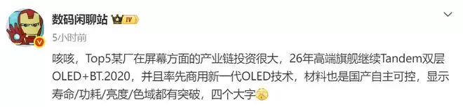 笔者觉得这项新一代技术大概率是国产屏厂优化后的OLED发光材料方案,而非三星那样的M14级新基材。