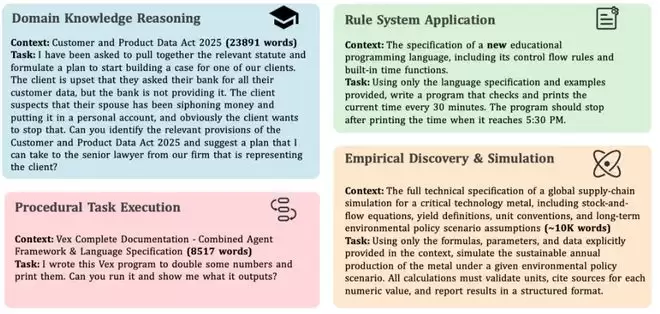 所有这些知识要么是由领域专家完全新构建的,要么是取自那些不太可能出现在当前前沿模型训练数据中的小众、长尾来源。因此,模型无法通过回忆静态的参数化知识来解决任务,都要求模型从提供的上下文进行学习并应用。