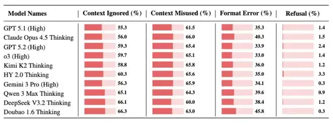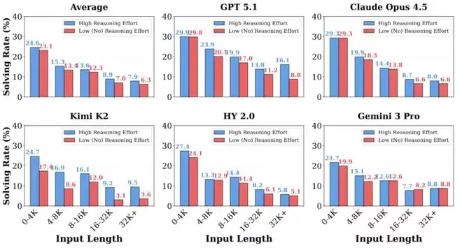 对部分模型来说,增加推理强度可以改善表现,使模型更深入地理解复杂上下文。例如,GPT-5.1在管理类和实验数据类任务上的表现提升约6%,但其他模型提升有限甚至可能下降,说明单靠更多推理并不足够,模型还必须能够正确吸收和组织上下文信息。