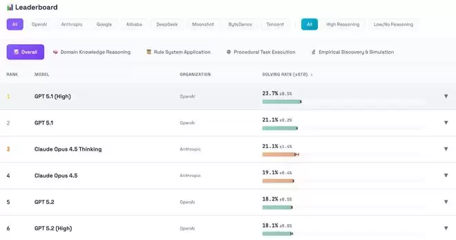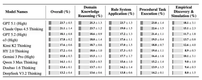 平均来看,模型仅解决了17.2%的任务。其中GPT-5.1(High)解决了23.7%的任务。