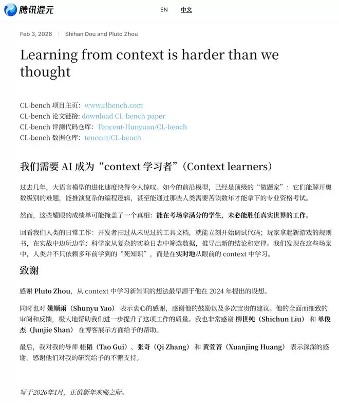 智东西2月3日报道,刚刚,腾讯混元官网上线姚顺雨团队最新成果,发布了专门评测大语言模型能否从上下文(Context)中学习新知识并正确应用的基准CL-bench。