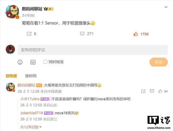 同样是来自微博博主的消息,他先是发文透露“菊菊(华为)在看1:1 Sensor 方形传感器,用于前置摄像头”,后又在评论区中补充道“大概率是先放在主打拍照的中端线”。