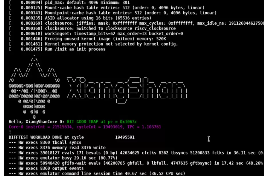 目前,“白杨”IP已取得重要的阶段性成果。在功能方面,该团队已经在帕拉丁硬件仿真平台上,成功将“白杨”与香山第三代“昆明湖”处理器核集成,并正常启动了Linux操作系统及其它测试应用,证明了其功能的正确性与稳定性。