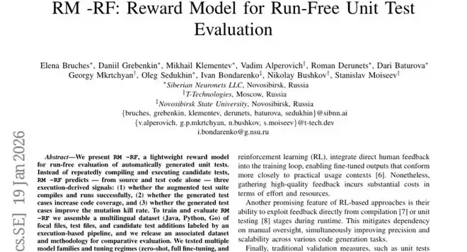 A:RM-RF是由西伯利亚神经网络公司开发的轻量级奖励模型,专门用于评估自动生成的单元测试质量。它的核心功能是无需编译和运行代码,仅通过分析源代码和测试代码就能预测三个关键指标:测试是否能正常编译运行、是否能增加代码覆盖率、以及是否能提高突变检测能力。