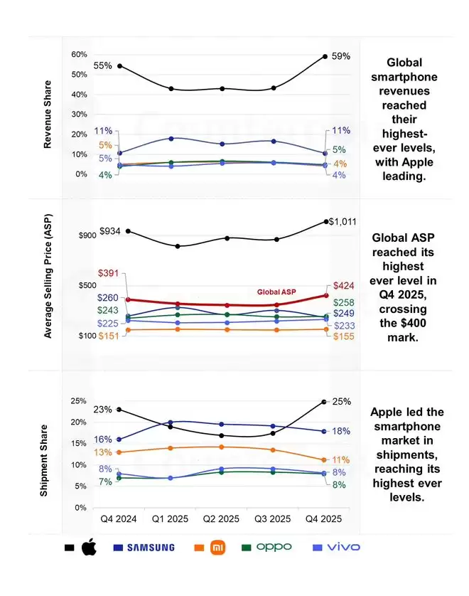 更令人扎心的是,知名数据调研公司Counterpoint Research的报告显示,在2025年第四季度,苹果虽然只占据了全球智能手机市场25%的份额,却拿走了该领域总收入的59%。而且在这一季度,得益于iPhone 17系列的强劲推动,全球智能手机的平均售价(ASP)达到了424美元的历史新高,约合人民币2942元。纵观全球前五的智能手机品牌,只有苹果一家的ASP远超行业平均值,其当季平均售价高达1011美元,约合人民币7014元。这主要是由于iPhone 17 Pro Max的销量占比超过了50%所导致的。